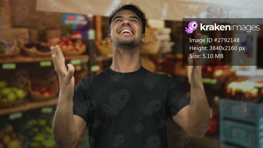 Young hispanic man standing in an outdoor fruit shop market smiling with enthusiasm amidst fresh produce and vibrant colors showcasing lively market atmosphere - Kraken Images