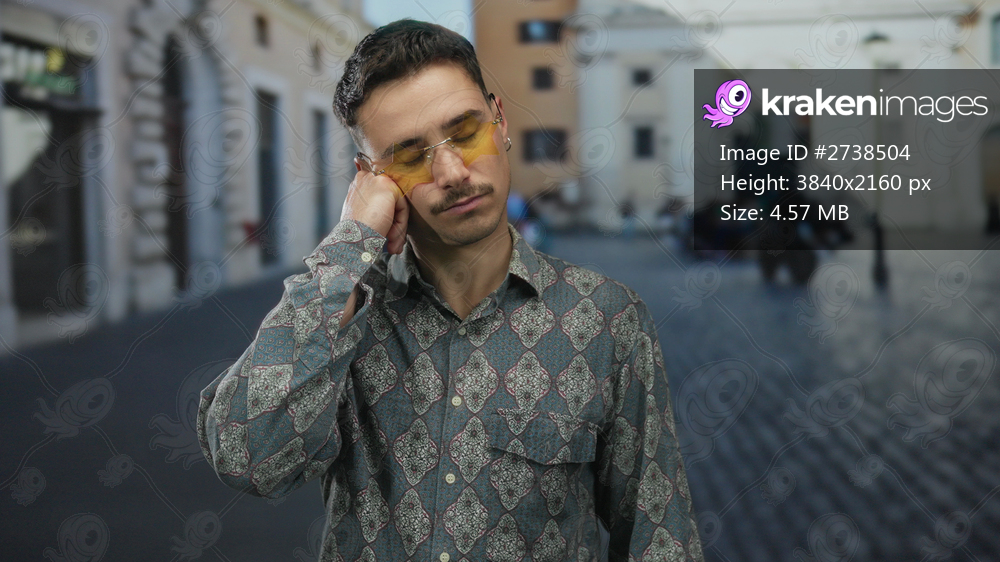 Young hispanic man standing on a city street outdoors looking tired and thoughtful with hand on chin wearing patterned shirt and yellow sunglasses.