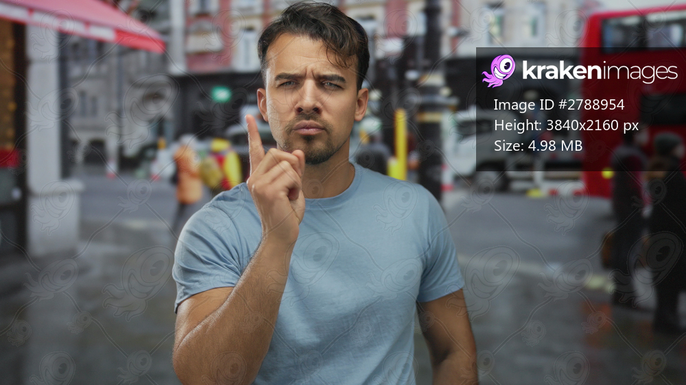 Young hispanic man standing on city street with iconic red double-decker bus in background, appearing serious and contemplative, wearing a casual blue shirt outdoors. - Kraken Images