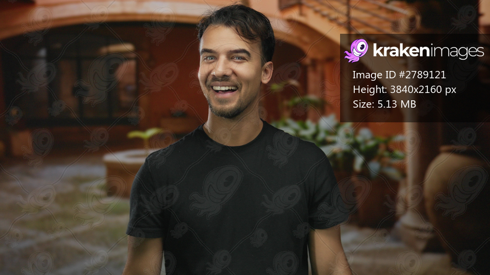 Young hispanic man standing on old town street with plants and cobblestones, dressed casually in an outdoor urban setting, reflecting a traditional architectural background. - Kraken Images