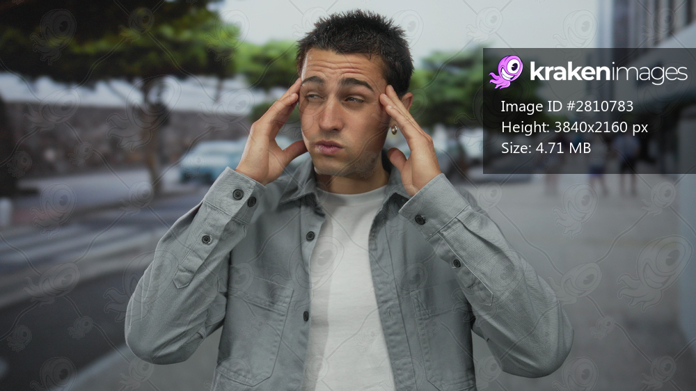 Young hispanic man standing on urban street outdoors in city wearing gray shirt appearing stressed touching head and looking thoughtful with defocused background of people and cars - Kraken Images