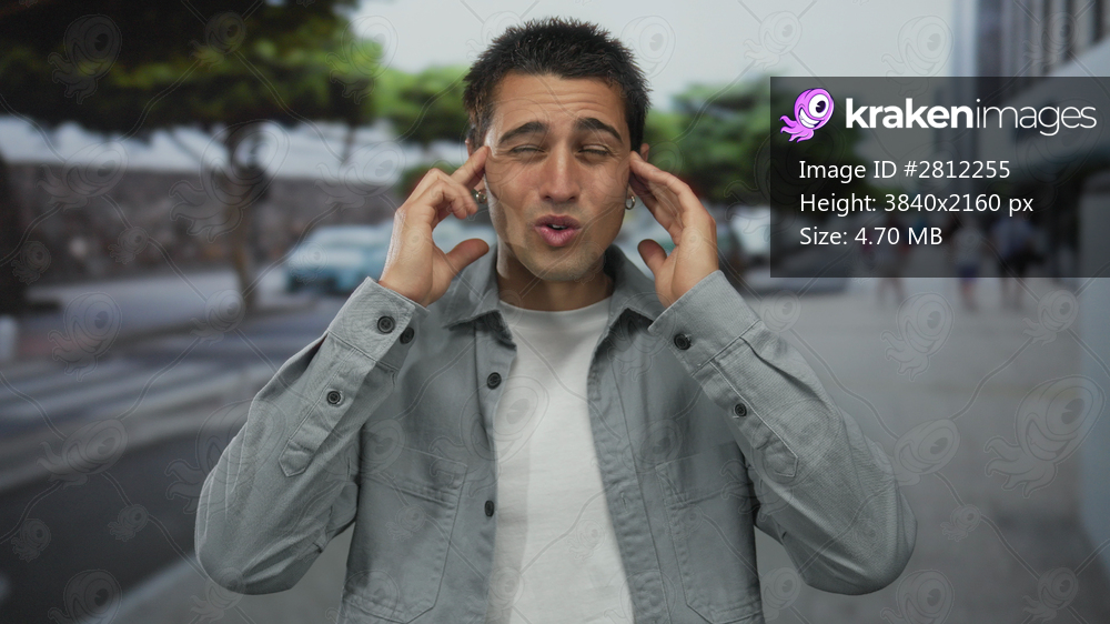 Young hispanic man standing on urban street outdoors in city wearing gray shirt appearing stressed touching head and looking thoughtful with defocused background of people and cars - Kraken Images