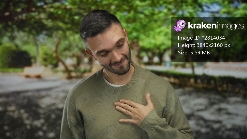 Young hispanic man standing outdoors in a green park, smiling warmly, hand on chest, surrounded by lush trees, exuding calm and peaceful vibes, dressed casually. - Kraken Images