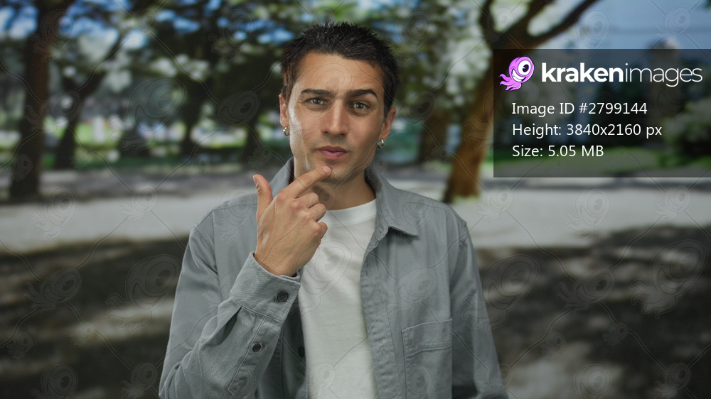 Young hispanic man standing outdoors in a sunny park gesture indicating thoughtfulness amidst green trees and shadows