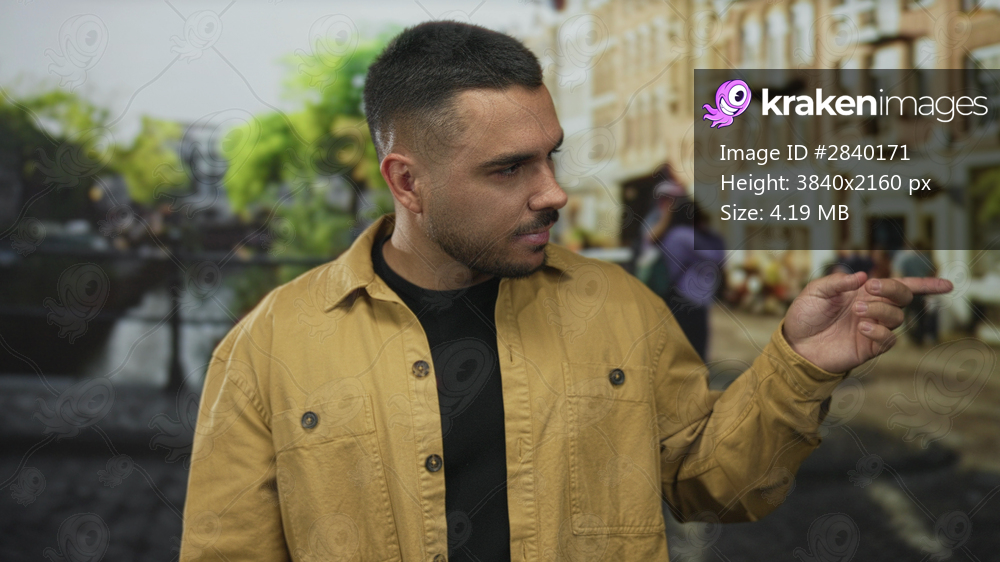 Young hispanic man standing outdoors points finger by canal railing on street with blurred passersby; introspection.