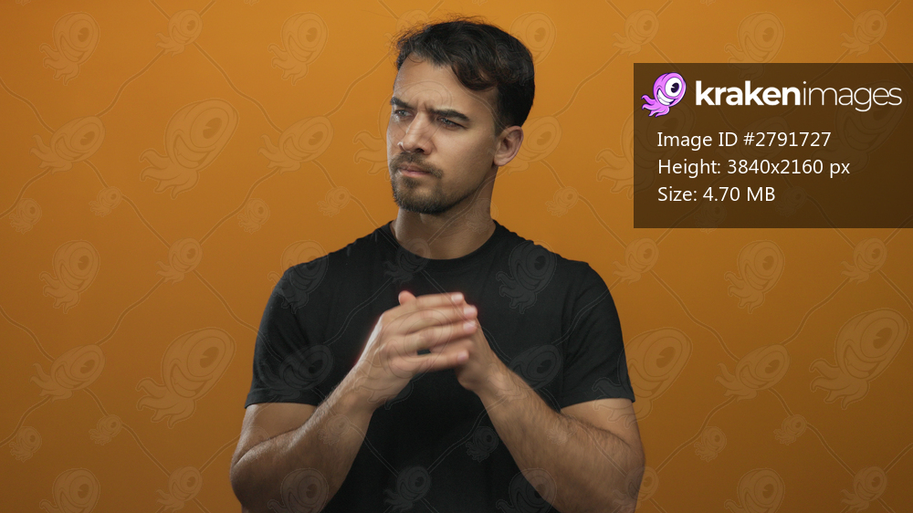 Young hispanic man standing thoughtfully against a vivid orange isolated background wearing a black shirt with a contemplative expression.