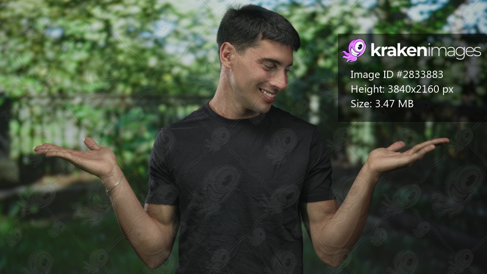 Young hispanic man stands smiling and shows open palms gesture amidst bright lush forest trees; confusion doubt indecision uncertainty.