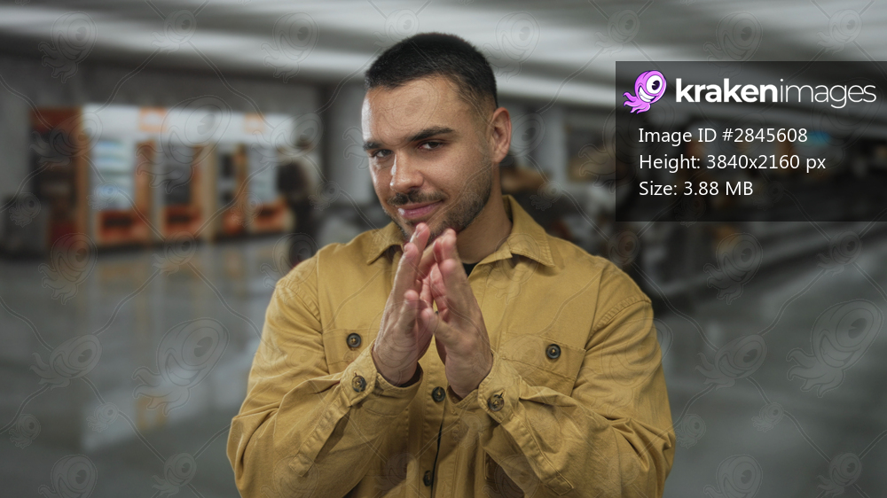 Young hispanic man steepling fingertips during check in in busy airport terminal concourse; confidence strategy planning ambition.