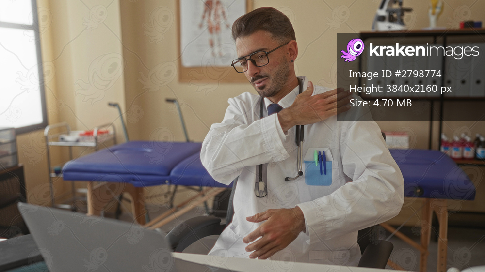 Young hispanic man with stethoscope and laptop forms heart shape gesture in building; compassion care empathy support.