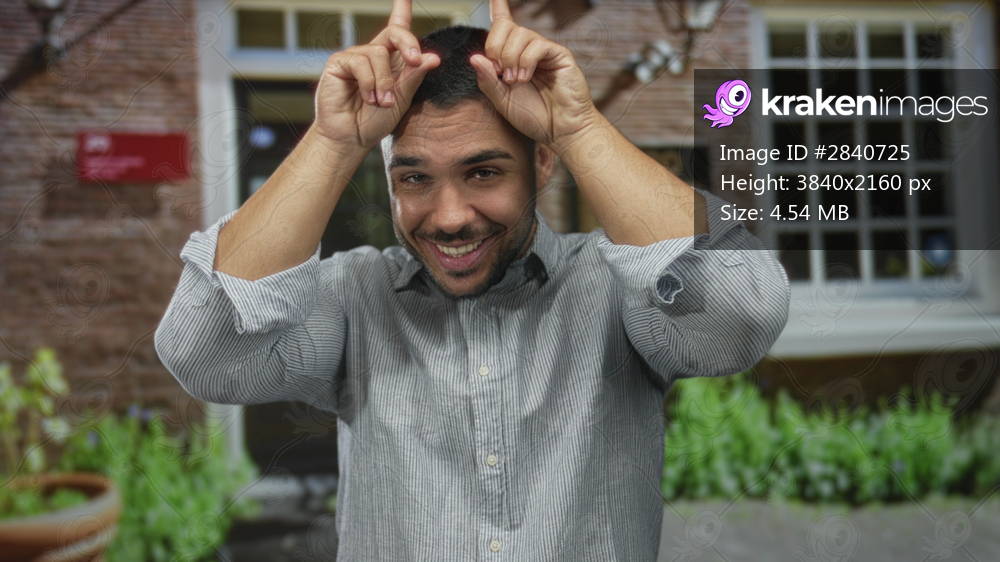 Young hispanic man with striped shirt smiles and points index fingers to head on building; playfulness.