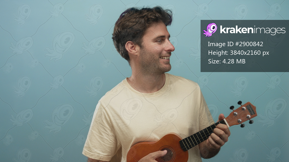 Young hispanic man strumming a ukulele and smiling in studio with light blue backdrop, wearing beige tee; carefree joy.