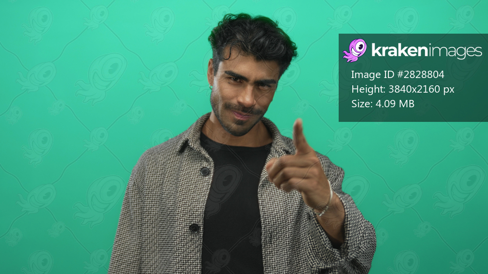 Young hispanic man with stubble making a karate chop gesture with hand in studio against a green wall; confidence.