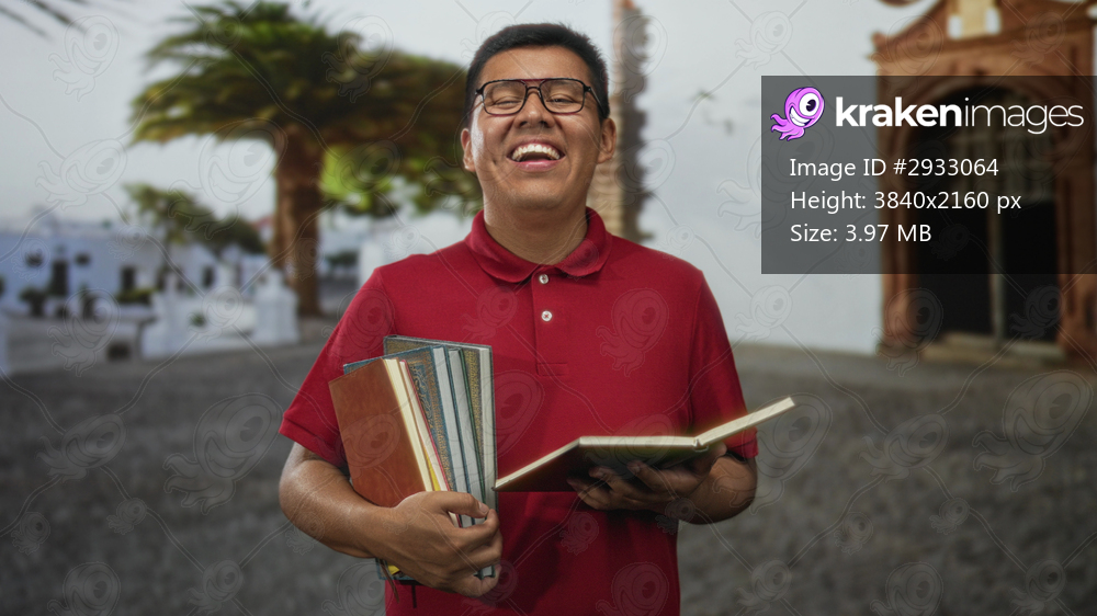 Young hispanic man student holding several books, laughing while reading on a cobblestone street; learning curiosity joy.