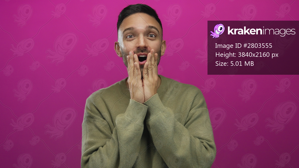 Young hispanic man with surprised expression stands against a vibrant pink background, hands on face in disbelief, showcasing emotional reaction and contemporary fashion. - Kraken Images