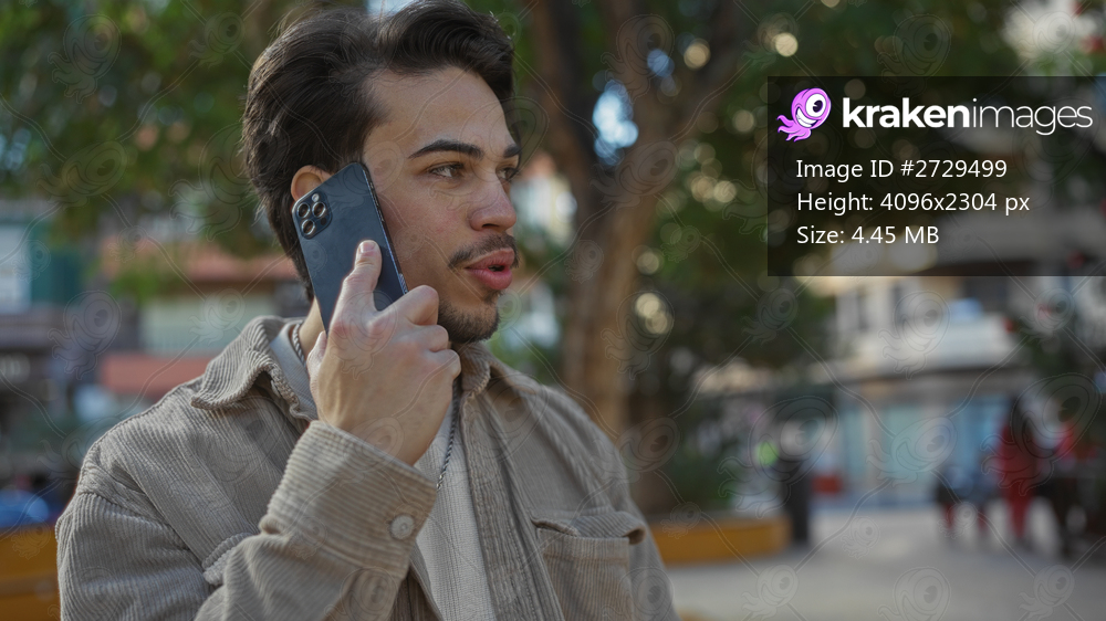 Young hispanic man talking on phone in urban park with trees and city buildings in background during daytime