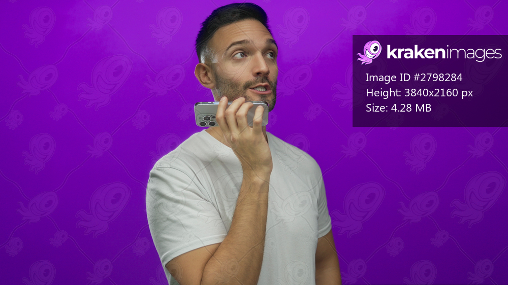 Young hispanic man talking on smartphone against vibrant purple background wearing casual white shirt.