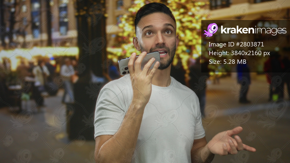 Young hispanic man talking on smartphone in urban city street during festive holiday evening with colorful lights and blurred people in the background