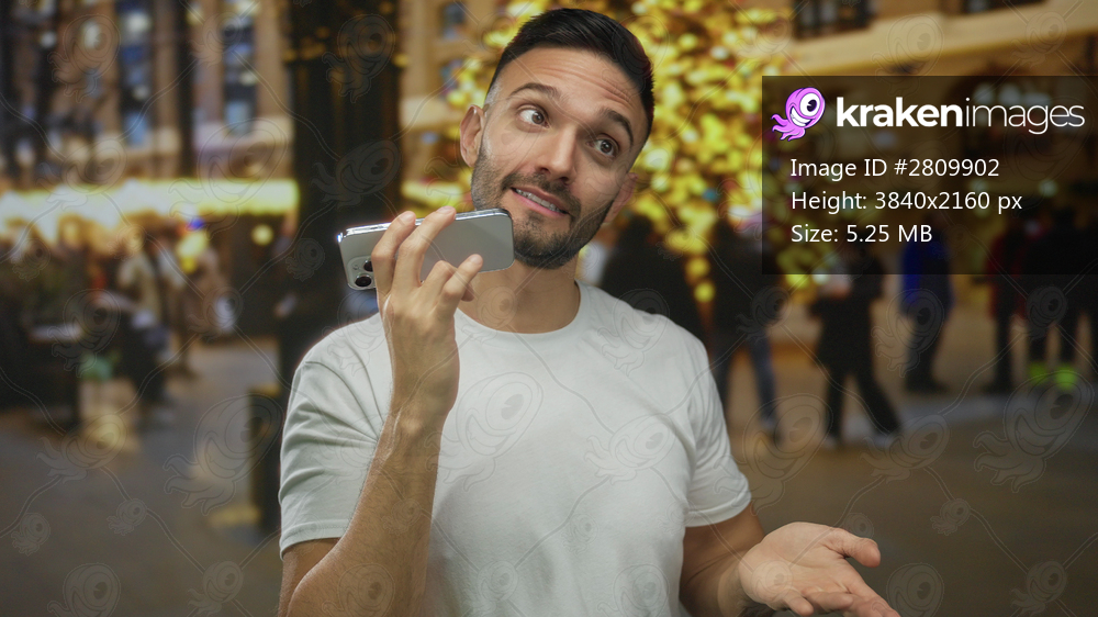 Young hispanic man talking on smartphone in urban city street during festive holiday evening with colorful lights and blurred people in the background