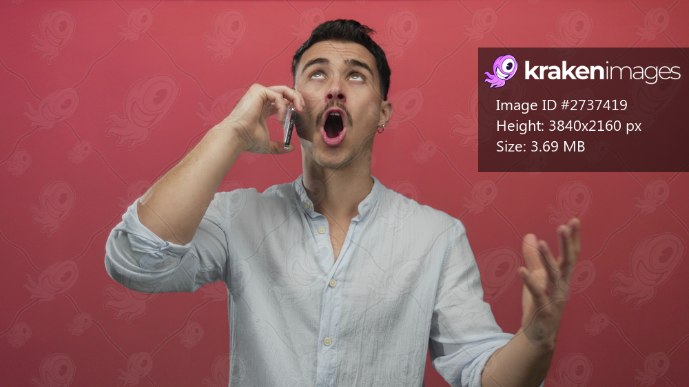Young hispanic man talking on smartphone over isolated red background, expressing frustration with intense gestures, wearing casual shirt indicating a heated conversation. - Kraken Images