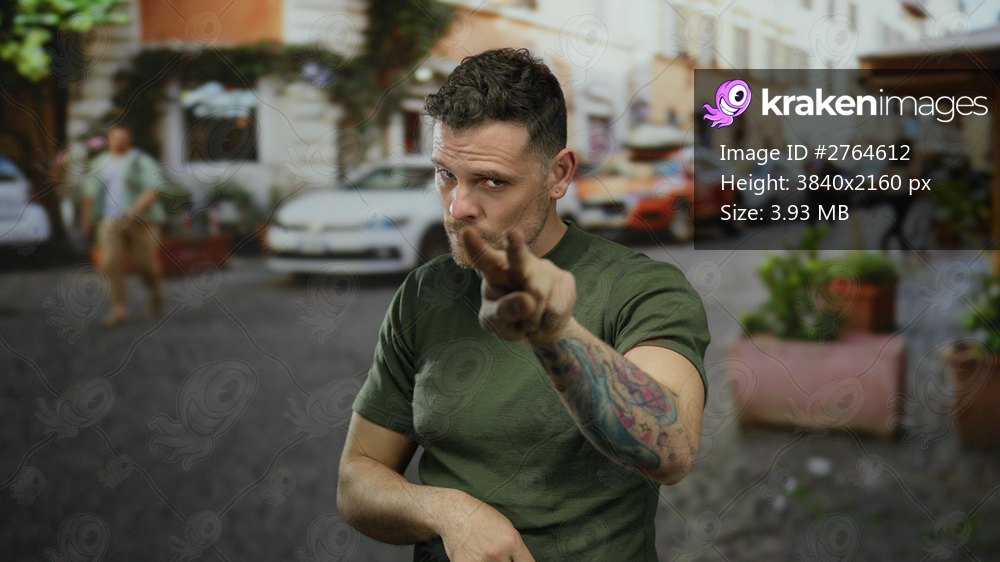Young hispanic man with tattoos making a gesture on a vibrant urban street, emphasizing observance and awareness among bustling city life.
