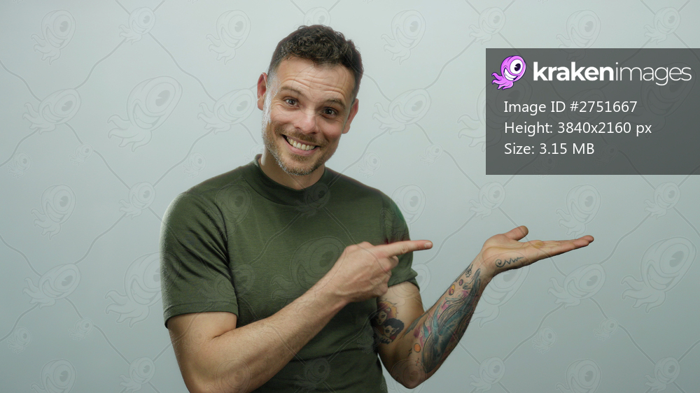 Young hispanic man with tattoos pointing to his open palm against a white background, smiling and looking friendly while wearing a t-shirt, isolated over a neutral wall. - Kraken Images