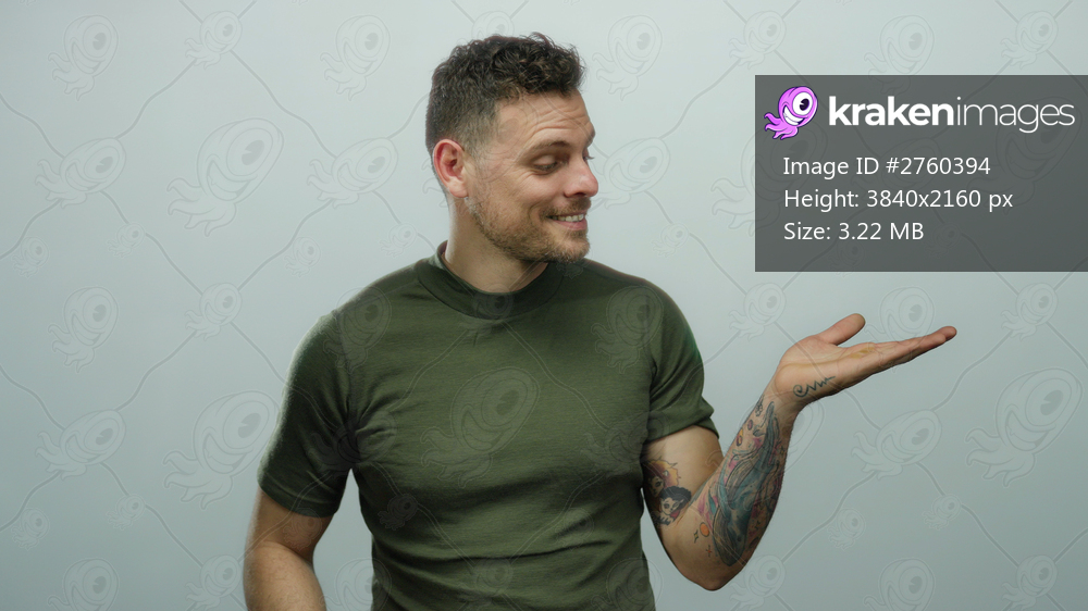 Young hispanic man with tattoos pointing to his open palm against a white background, smiling and looking friendly while wearing a t-shirt, isolated over a neutral wall. - Kraken Images