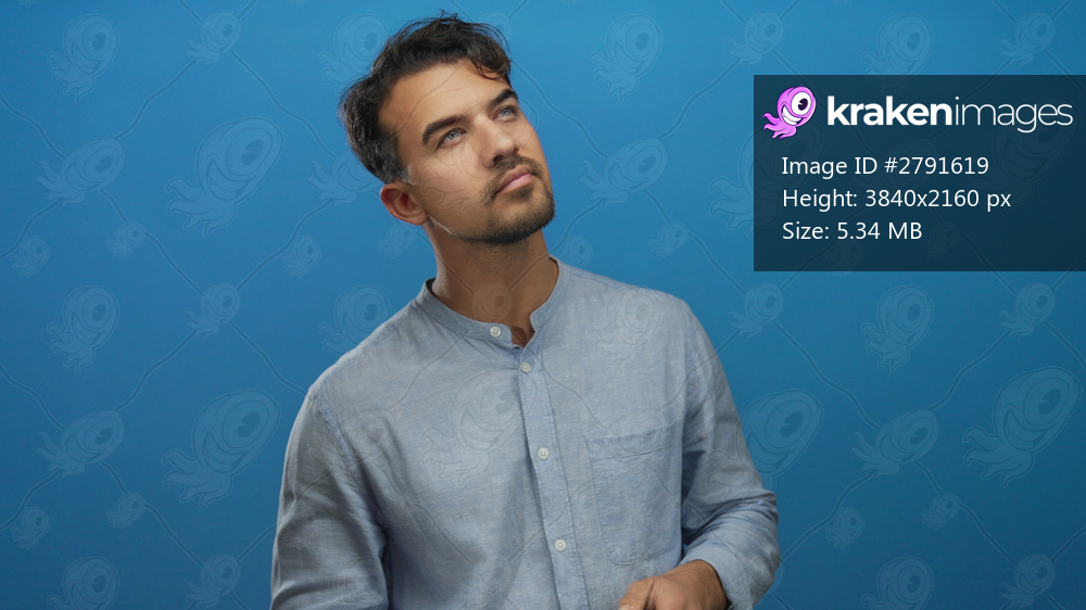Young hispanic man thinking with camera against isolated blue background, wearing casual shirt, conveys creativity and contemplation in a studio setting. - Kraken Images