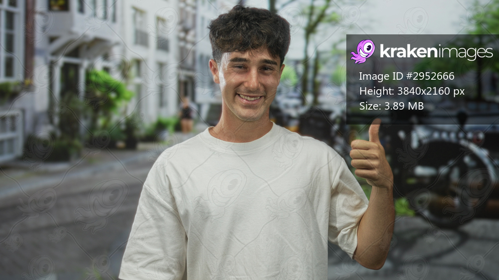 Young hispanic man with thumb raised and pointing upward on a street wearing white tshirt; optimism casual travel.