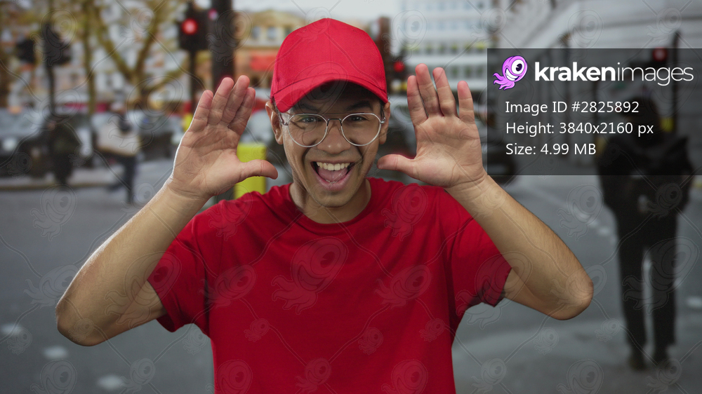Young hispanic man tipping red cap on bustling city street with blurred traffic; optimism and confidence.