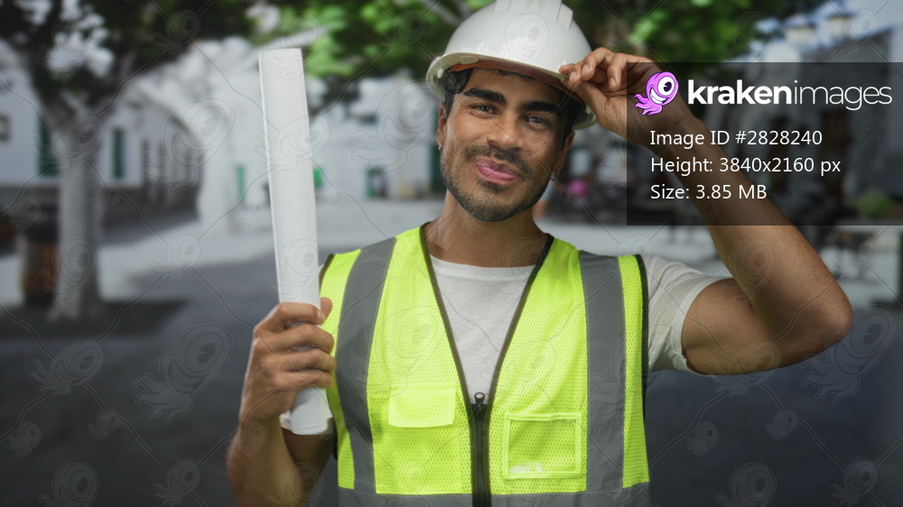 Young hispanic man tips white hardhat holding rolled blueprint on sunlit city street; confidence ambition.