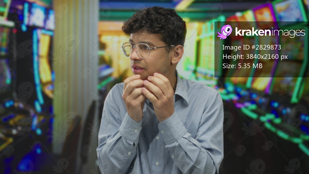 Young hispanic man touches cheek while standing next to slot machine in bright casino floor; toothache anxiety.