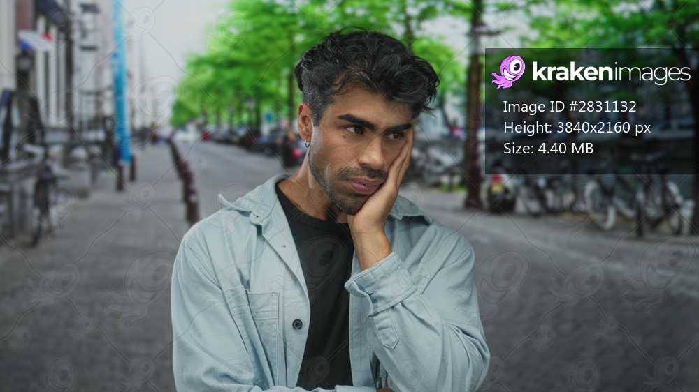 Young hispanic man touches his cheek while looking fatigued on a cobblestone city street; toothache.