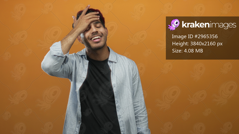 Young hispanic man touching forehead with hand while smiling in a studio setting with orange backdrop and casual shirt; casual amusement.