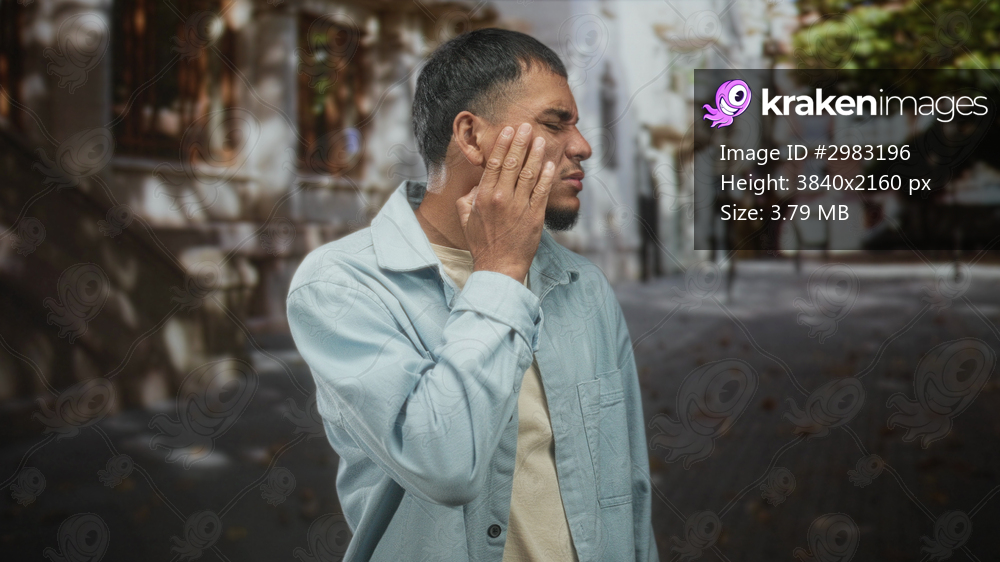 Young hispanic man touching his cheek and wincing on a tree lined city street with stone buildings and scattered leaves; pain concern.