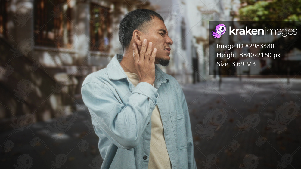 Young hispanic man touching his cheek and wincing on a tree lined city street with stone buildings and scattered leaves; pain concern.