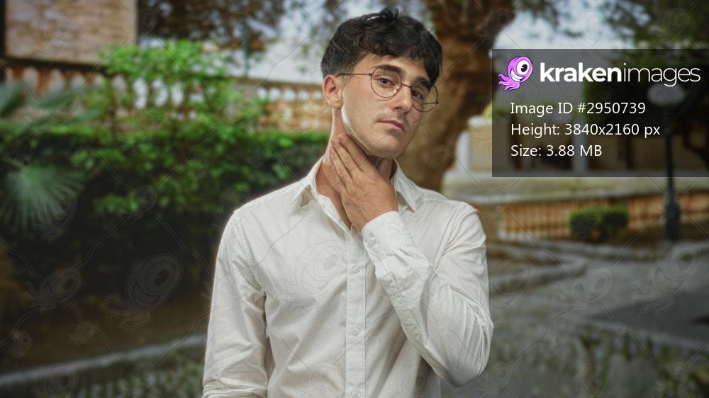 Young hispanic man touching his neck with hand, wearing round glasses and white shirt in a cobbled street park beside stone balustrade and tree; pensive reflection. - Kraken Images
