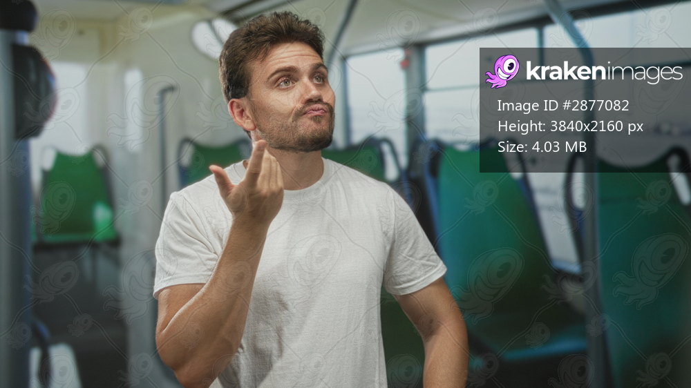 Young hispanic man touching temple with finger inside bus with green seats on street; thoughtful reflection curiosity.