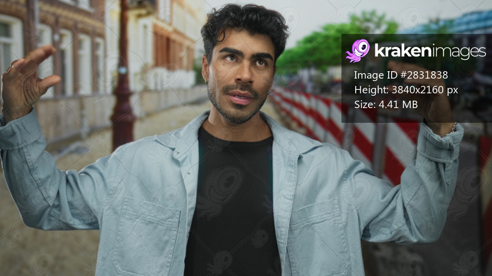Young hispanic man uses hand gestures while speaking on street; expression communication conversation engagement.