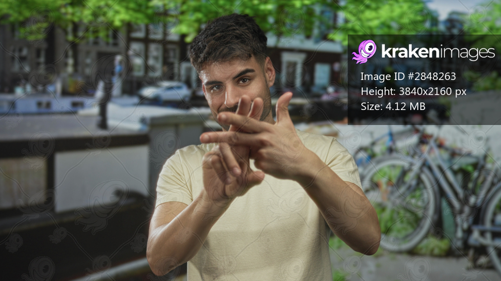 Young hispanic man uses interlaced fingers to form a hashtag sign on a busy city street; enthusiasm.