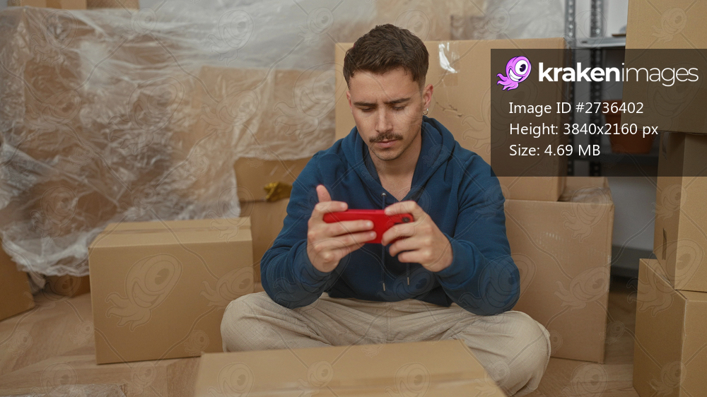 Young hispanic man using phone in new home surrounded by boxes indicating recent move into apartment living room.