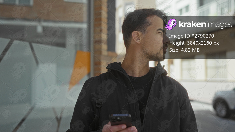 Young hispanic man using smartphone on a city street outdoors with a thoughtful expression in casual attire during daylight.