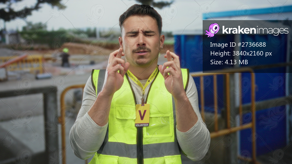Young hispanic man with volunteer badge wearing reflective vest stands at outdoor construction site fingers crossed hopeful expression