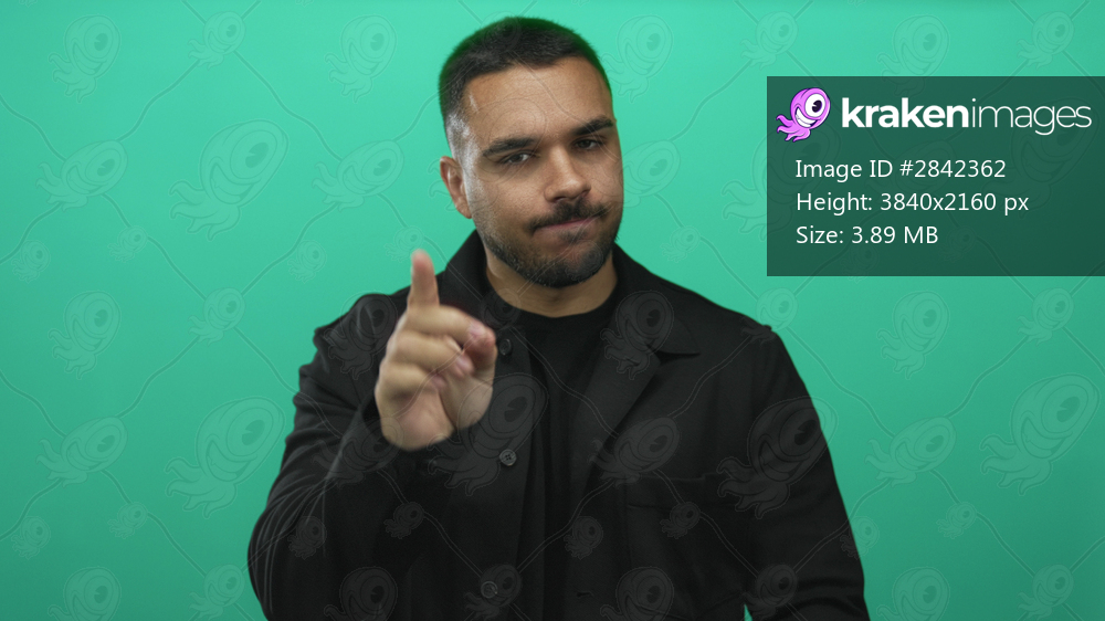 Young hispanic man wearing a black jacket with crossed arms against a vibrant green studio wall; rejection.