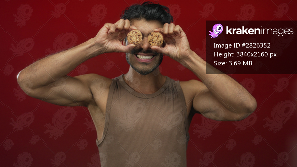 Young hispanic man wearing a brown tank top smiles while holding cookies over eyes in a red studio; joy.