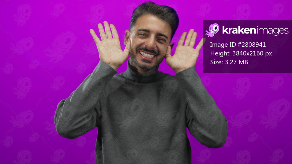 Young hispanic man wearing a grey turtleneck smiling raises hands with open palms in studio; playfulness joy.