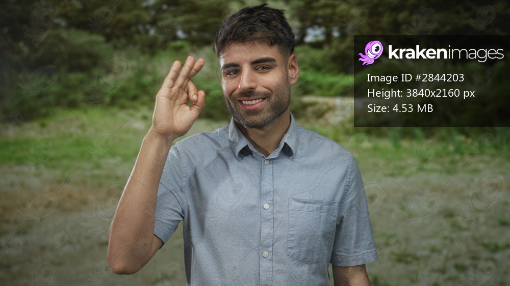 Young hispanic man wearing a light blue shirt making an ok sign with his right hand in a green park outdoors; approval.