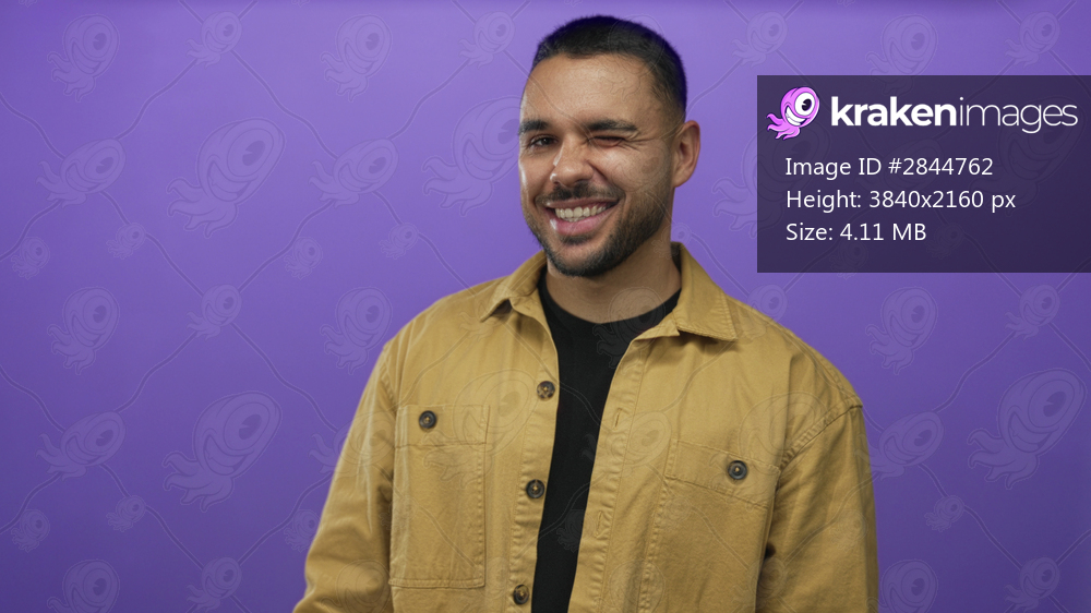 Young hispanic man wearing a mustard shirt with bearded face smiling with closed eyes in a purple studio; confidence.