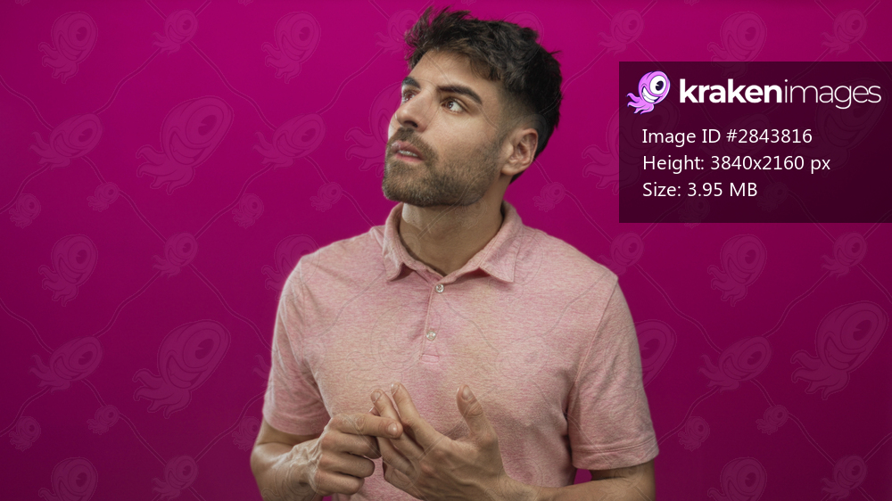 Young hispanic man wearing a pink polo shirt touches finger to palm in a soft pink studio; contemplation.