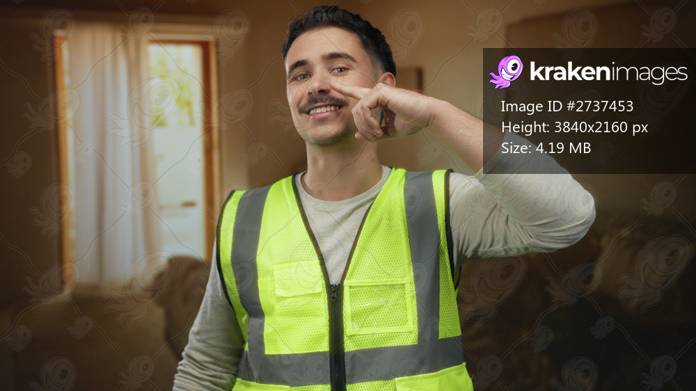 Young hispanic man wearing a reflective vest indoors at a hotel, pointing to his nose, creating a casual and playful atmosphere with natural daylight streaming through windows. - Kraken Images