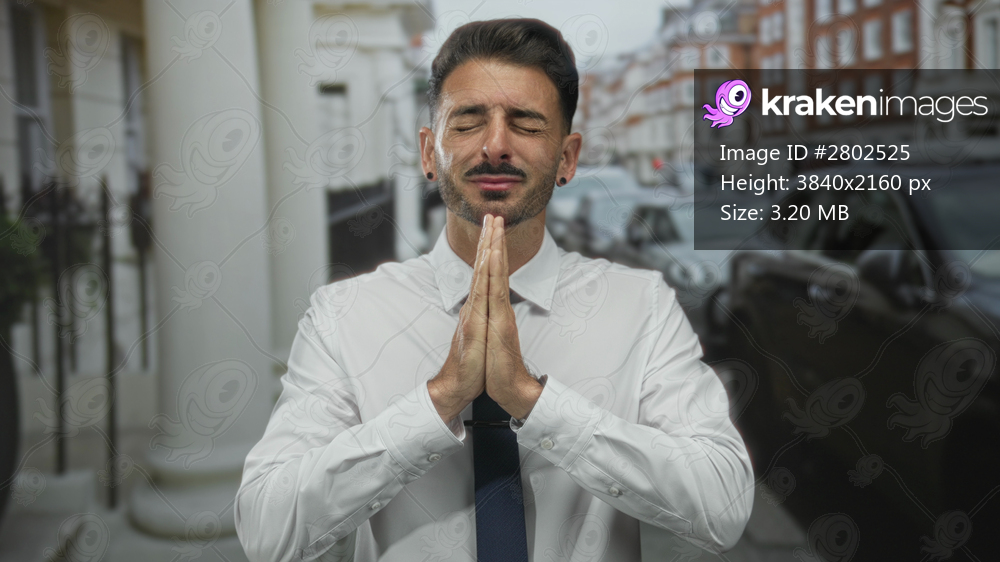 Young hispanic man wearing a white shirt and navy tie presses bare hands together on a city street lined with parked cars; hope.